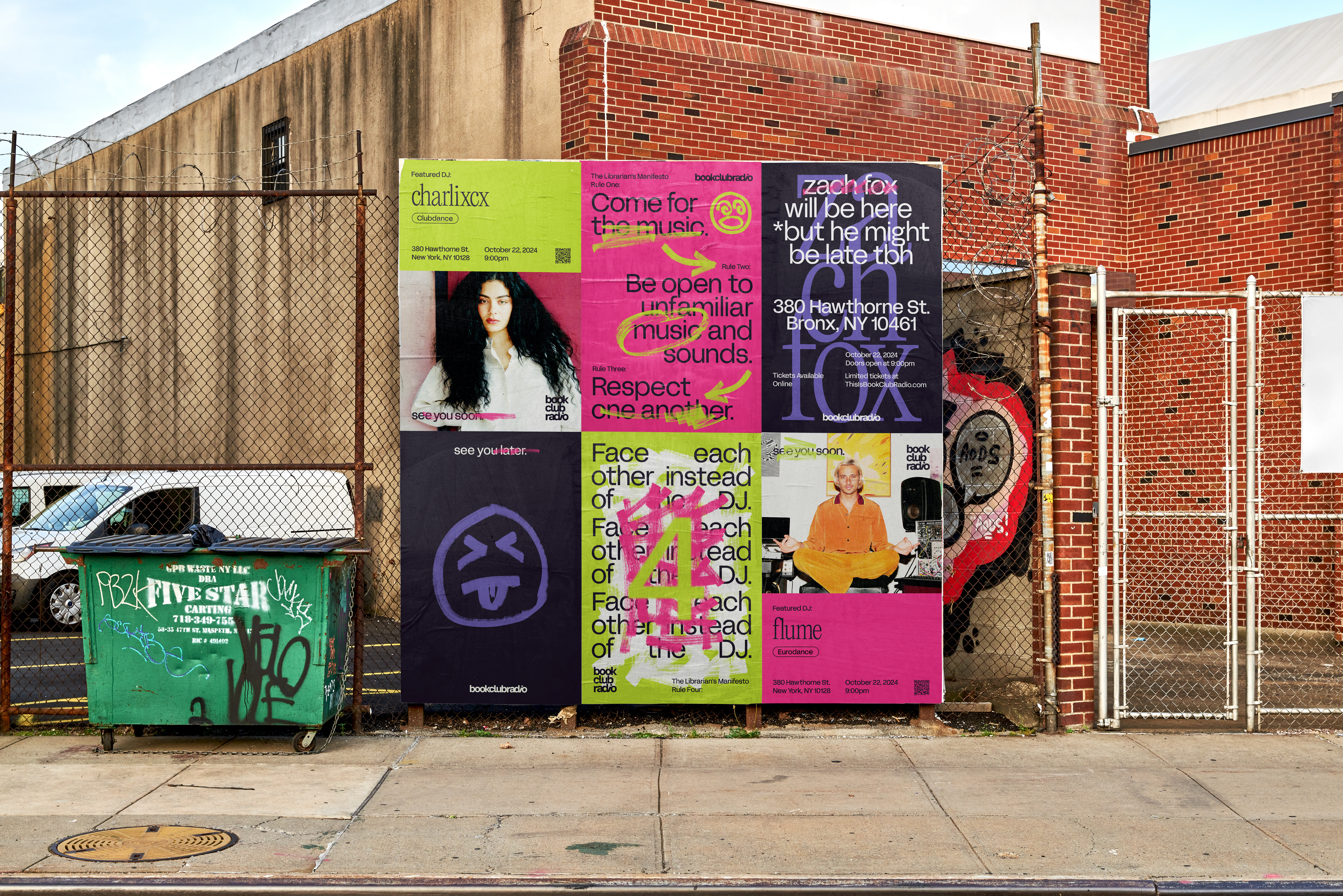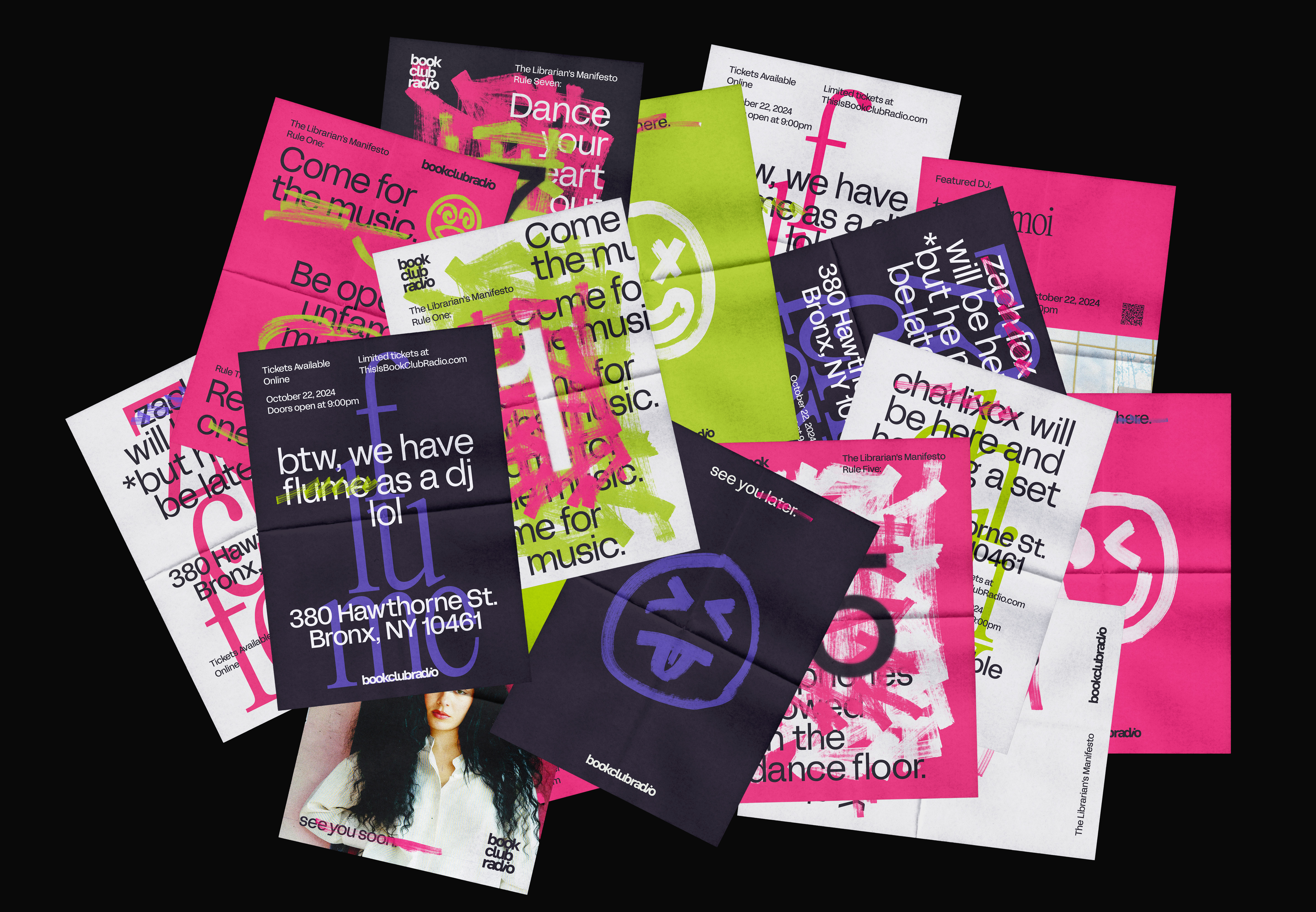 A dynamic and energetic new identity for Book Club Radio that embodies the energy and excitement of their pop-up dance club events, seamlessly capturing the vibrancy and spirit of their parties.