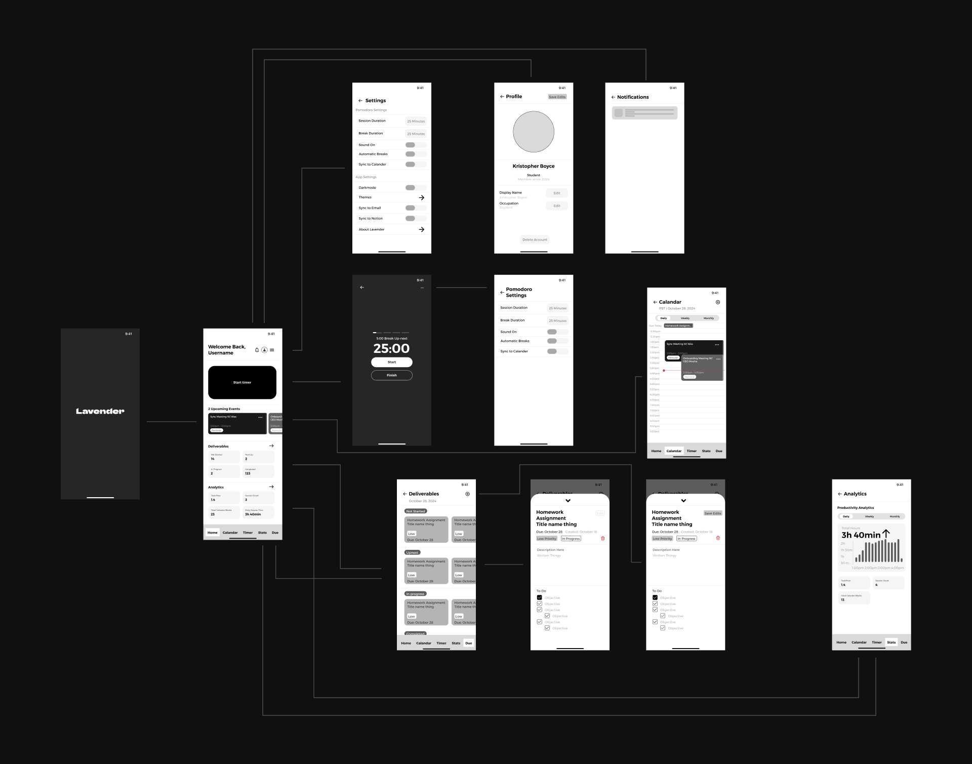 That was to have a planner that served its primary functions without feeling overwhelming or cluttered. This perspective shaped both the use cases and the people I interviewed, including other students and professionals who were looking for something similar. Its features include customizable timers, break reminders, a dynamic task tracker, and detailed progress analytics. Lavender empowers both students and professionals to take control of their time and achieve their goals with clarity and ease.