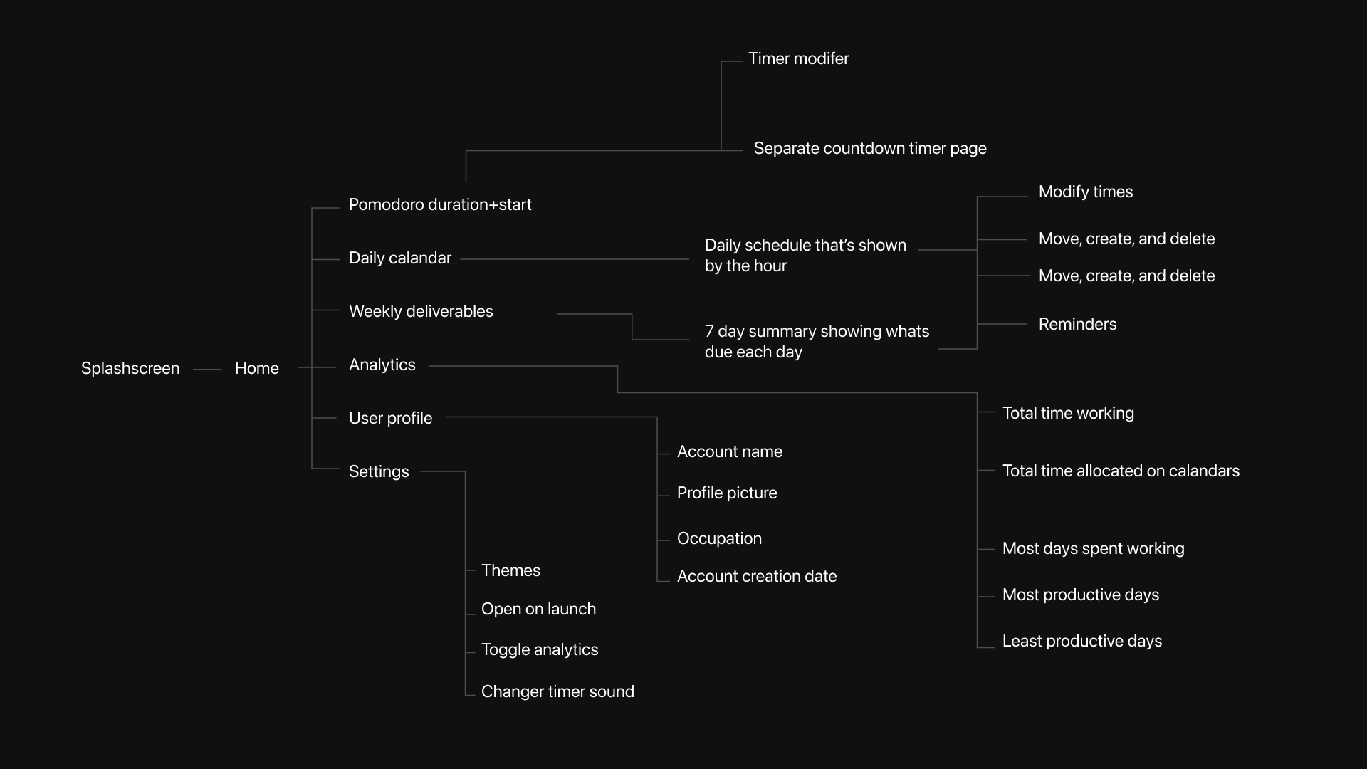 Through researching user habits, I found that many people are reluctant to record their work, as it feels like an extra layer of friction that gets in the way of actually getting things done. This core insight heavily influenced the information architecture and wireframe design for Lavender. The design prioritizes immediacy and minimal effort. The goal was to reduce the number of steps required to start a timer, ensuring that users can begin a session with the fewest possible taps. Given the variables involved in a user simply opening their phone, I made the key features of the app accessible directly from the home screen upon launch.